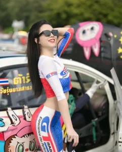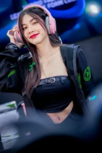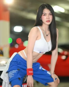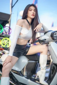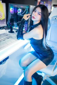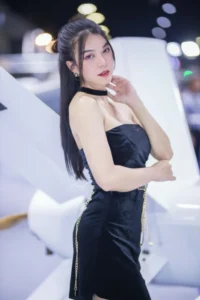 แต่แฝงด้วยความตั้งใจ เธอนั่งอย่างมั่นคงบนกล่องอุปกรณ์ ราวกับเป็นส่วนหนึ่งของการจัดแสดง ไม่ใช่เพียงผู้มานั่งชั่วคราว การยกมือขึ้นถือสินค้าอย่างมั่นใจ แสดงให้เห็นถึงบทบาทของเธอในฐานะผู้แทน หรือ พรีเซนเตอร์ที่รู้หน้าที่ และ เข้าใจสิ่งที่กำลังนำเสนอ ท่าทางขี้เล่นเล็กน้อยช่วยลดความเป็นทางการ ทำให้เธอดูเข้าถึงง่าย และ เป็นมิตร